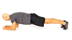 في هدا التمرين نقف على يدينا كما هو موضح في الصورة ثم نعود لوضع المرفق على الأرض و هكدا مع الحفاظ على الجسم في وضع مستقيم