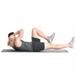 - قم برفع الركبة اليمني باتجاه الصدر مع تحريك الكوع الايسر باتجاهها مع استرخاء القدم اليسرى.